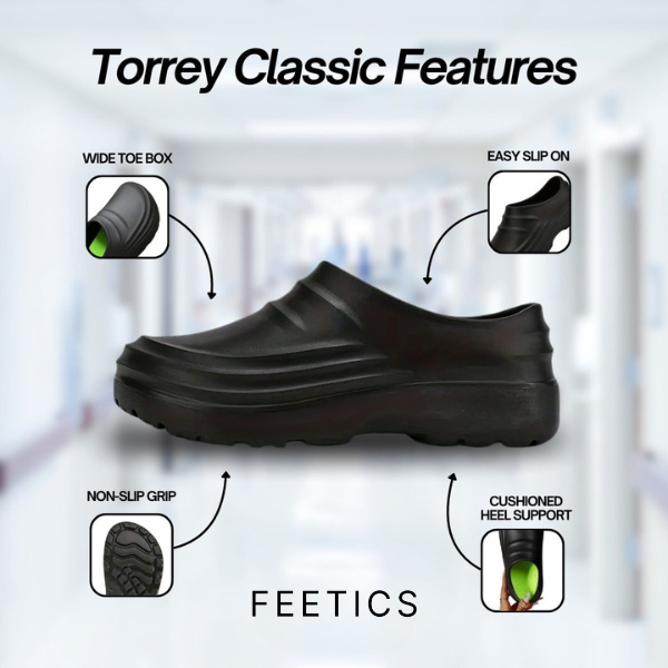 Feetics clogs are designed for all-day relief, combining flexible support, cushioned soles, and a roomy toe box to ease foot pain from conditions like neuropathy, arthritis, and plantar fasciitis.